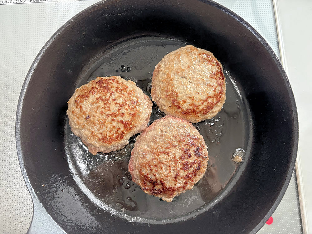 フライパンを弱火で温めてから、ハンバーグをのせてふたを閉め、弱火で5~6分焼く → 裏返してふたをし、弱火で5~6分焼きます